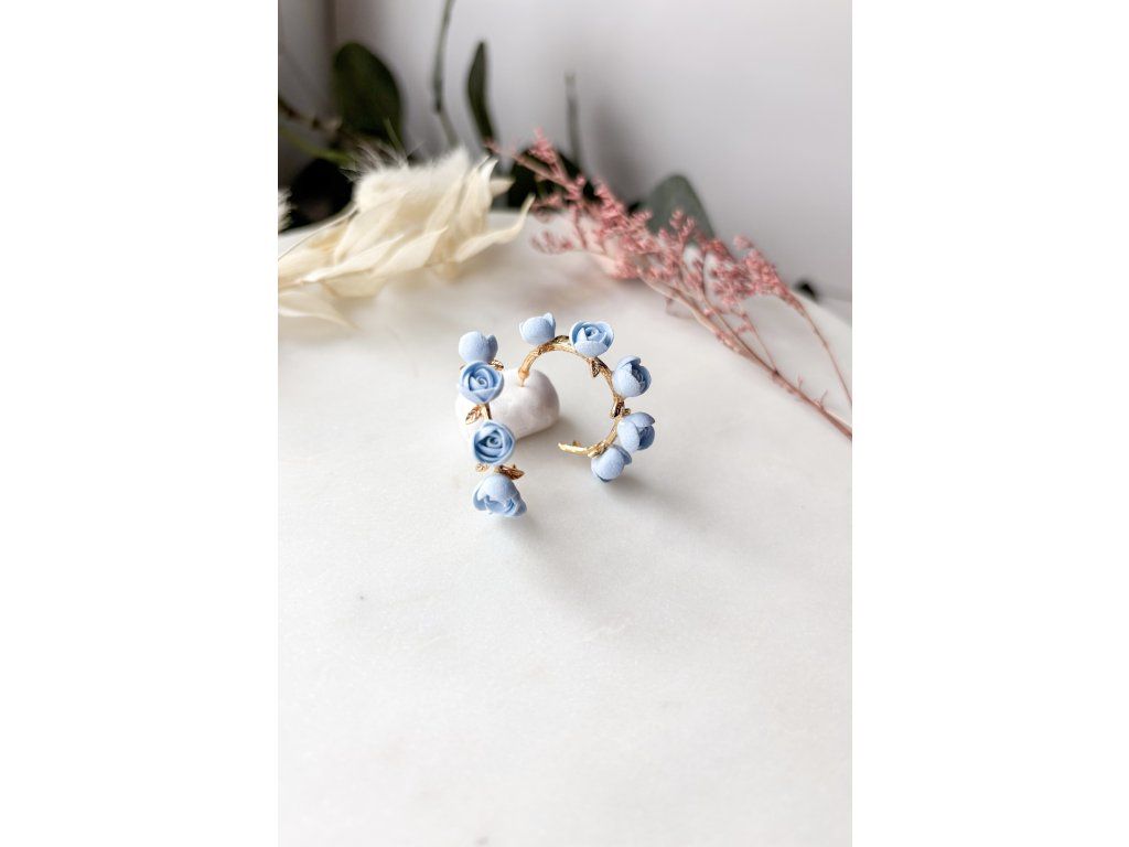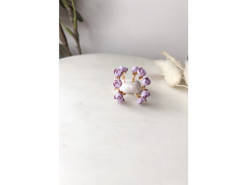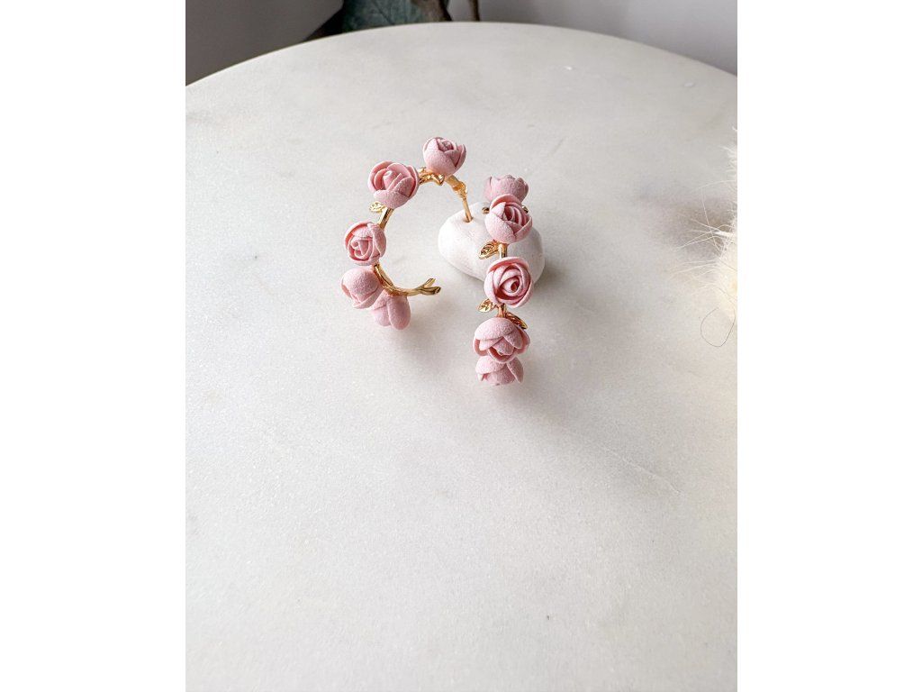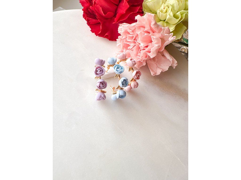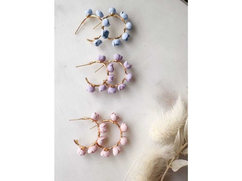 Kruhové náušnice zdobené drobnými kvítky,které působí něžně a romanticky.Každý okvětní lístek je ručně tvarovaný z polymerové hmoty,díky čemuž je každý pár originál.