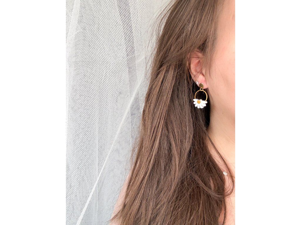 Jemné květinové náušnice s motivem kopretiny na zlatém kroužku.