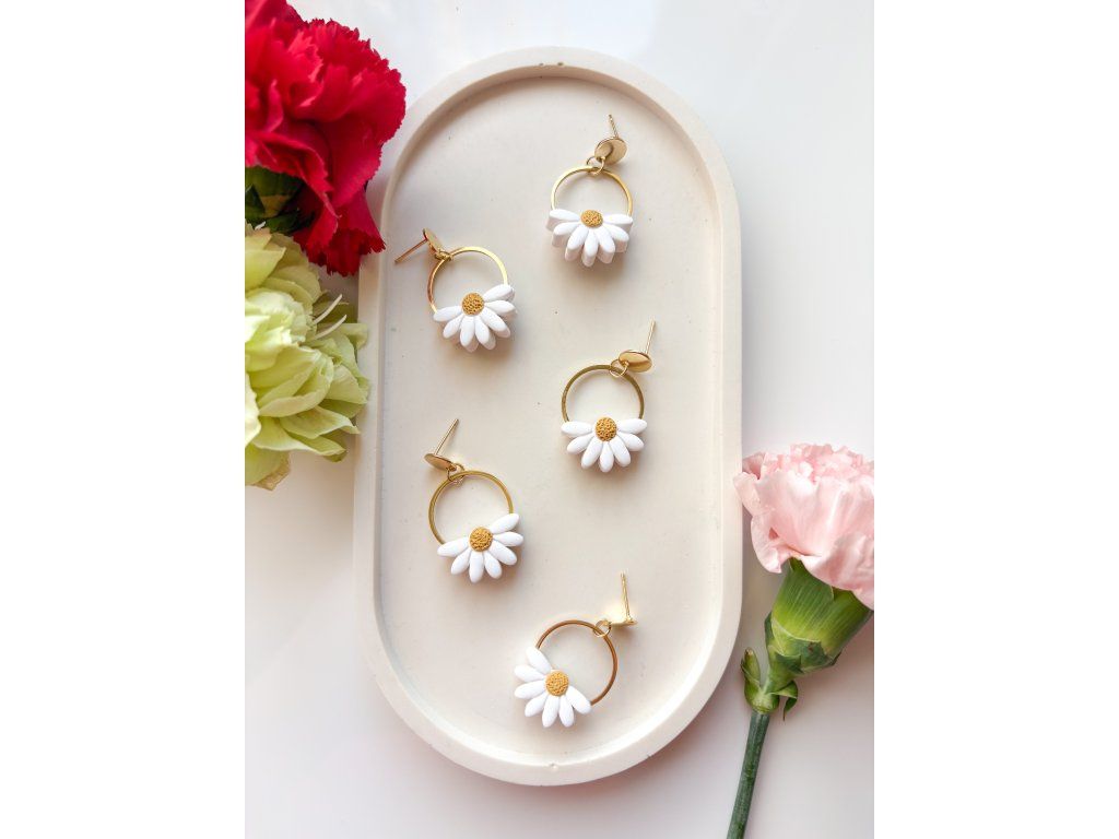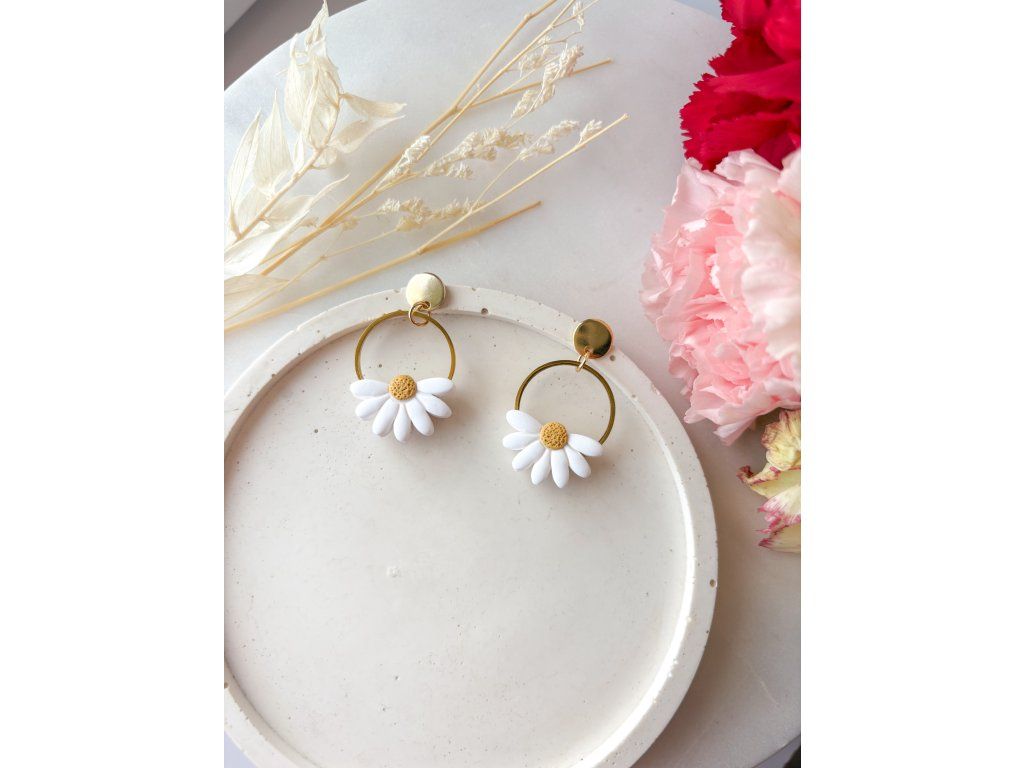Jemné květinové náušnice s motivem kopretiny na zlatém kroužku, které působí svěže, něžně a přirozeně. Minimalistický design v kombinaci bílé a zlaté barvy dodává náušnicím lehkost a nadčasovou eleganci. Každý květ je ručně vyrobený z polymerové hmoty, díky čemuž je každý pár originální a jedinečný.