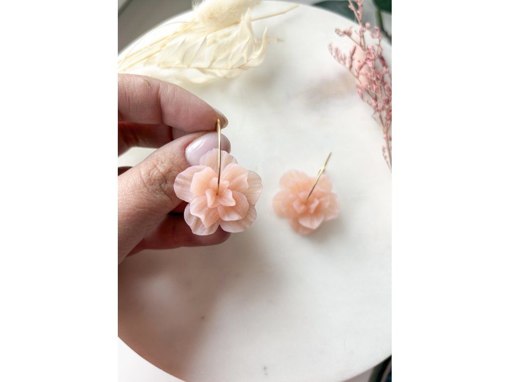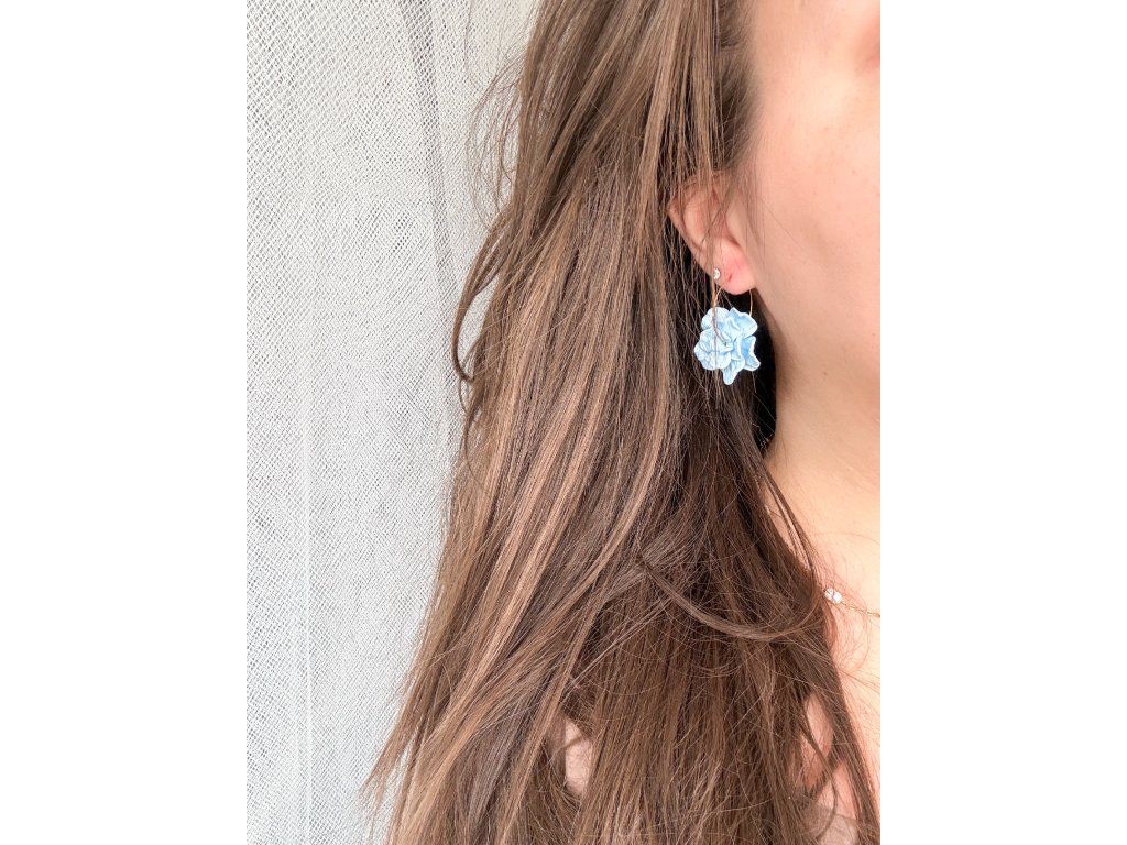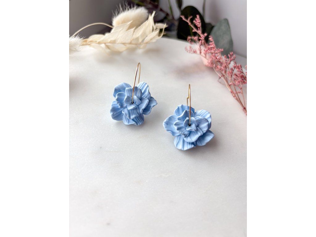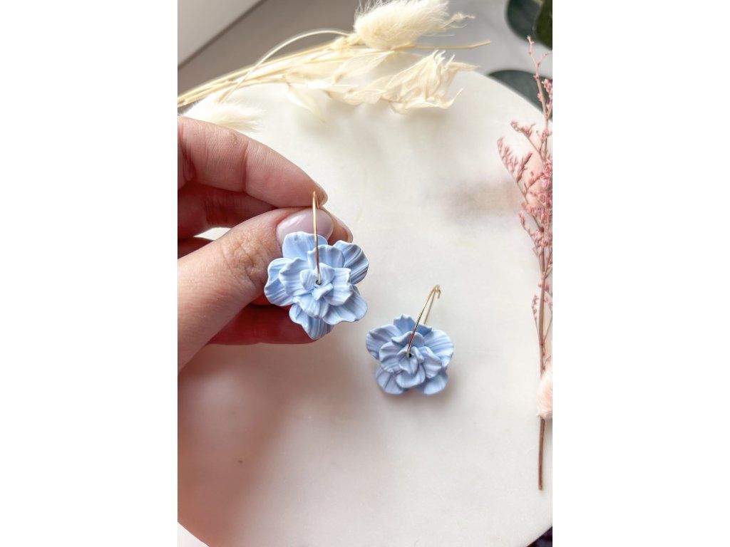 Jemné květinové náušnice v něžném modrém odstínu, které působí elegantně, romanticky a velmi žensky. Každý lístek je modelovaný ručně z polymerové hmoty, díky čemuž je každý pár originální a jedinečný.