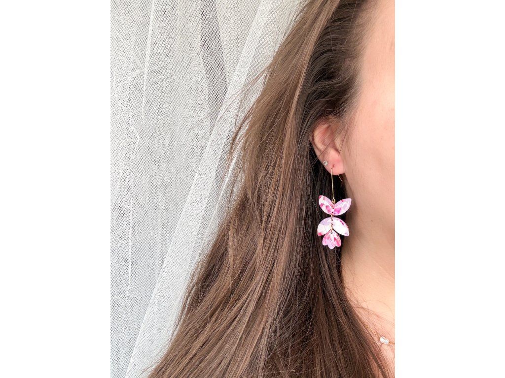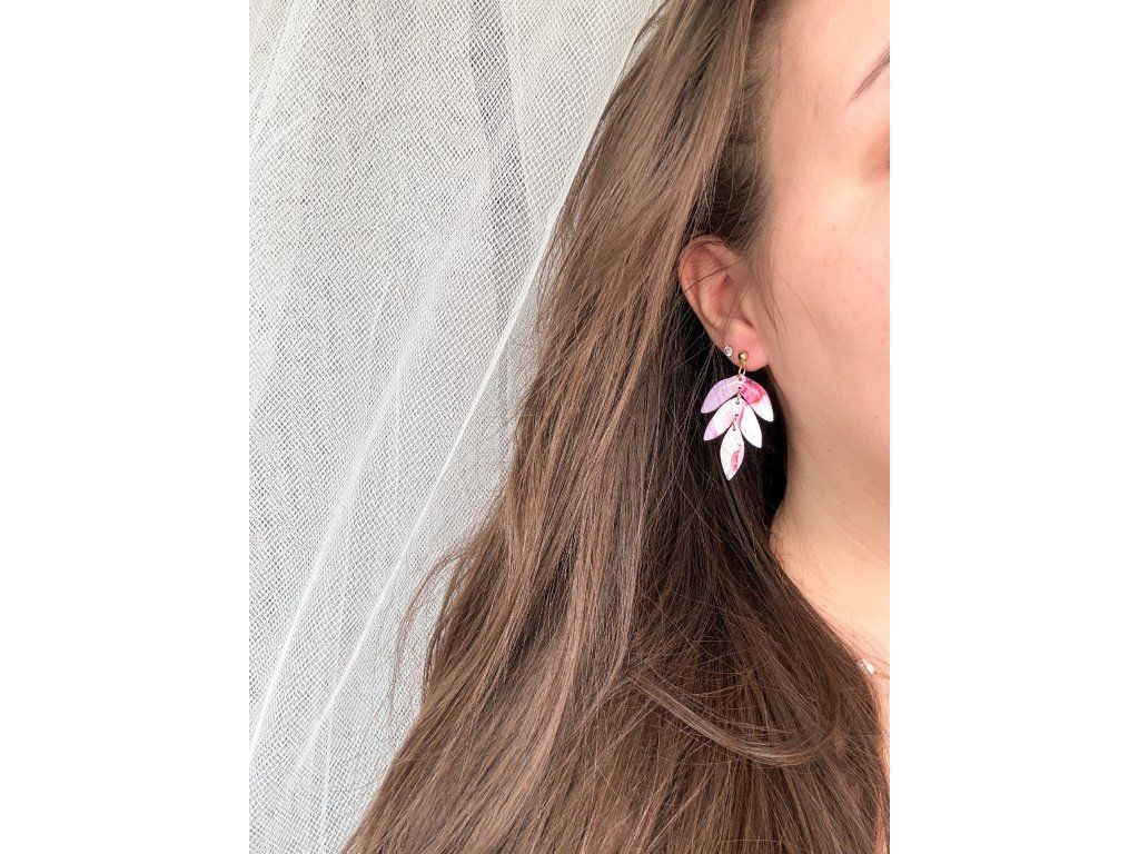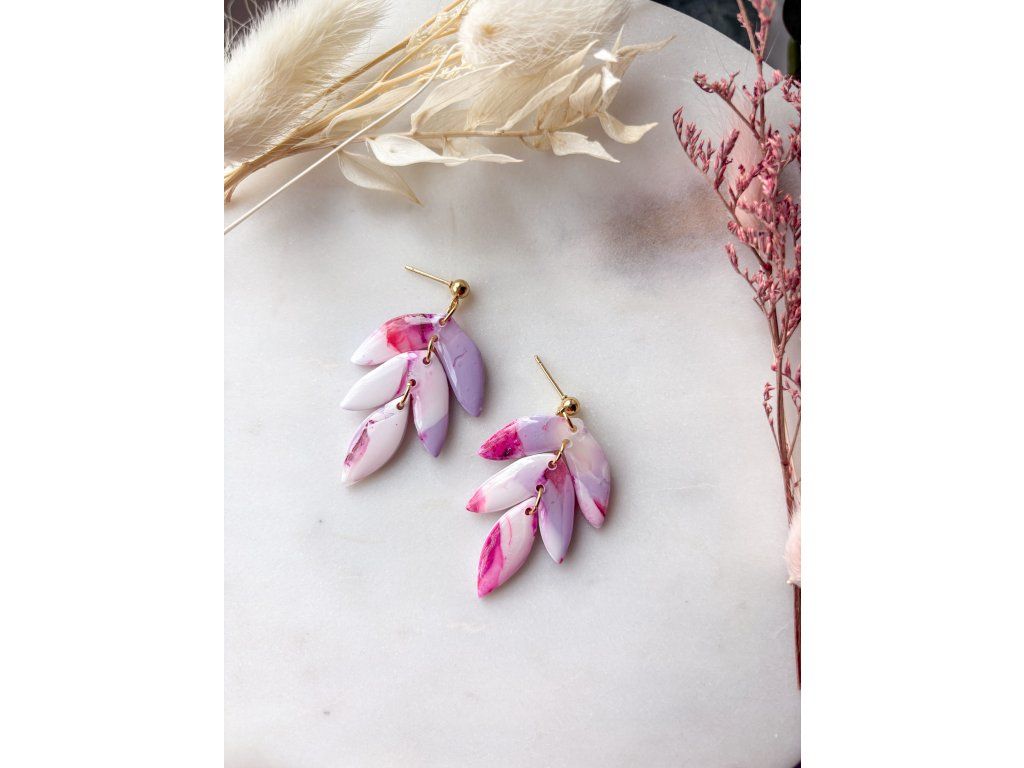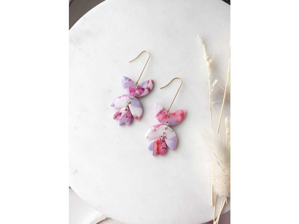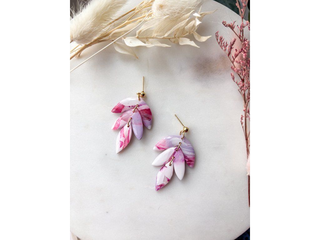 Výrazné visací náušnice v jemných odstínech růžové, bílé a fialové. Díky mramorovému efektu působí originálně, něžně a zároveň nepřehlédnutelně. Každý pár je ručně vyrobený z polymerové hmoty a díky použité technice není možné vytvořit dva zcela stejné kusy – jedná se tak o jedinečný originál svého druhu.